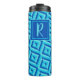 Sip from this Monogram Blue Three-Tone Diamond Pattern Thermal Tumbler. It features a geometric diamond pattern in three shades of blue with an initial in light blue against a dark blue square. Personalise it with your initial. A great gift idea for a stylish woman on the go.