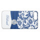 Monogrammed modern blue and white floral damask pattern Case-Mate iPhone 7 Case with PRINTED ribbon and PRINTED faux engraved look crystal brooch. Customise it to add your name, initial, or other text. If you need assistance, email niteowlstudio@gmail.com.