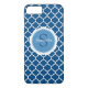 A pretty, classic blue, and modern personalised cell phone case with a quatrefoil pattern in the background. Add your monogram and name. Designed for you by Blackberry Boulevard.