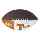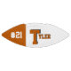 This is a full size football with one panel designed with a monogram name (large first letter) and uniform number, in popular college colours. This one is shown in burnt orange and white The football is also available with two white panels so that a 2nd panel may include designs or room for signatures.