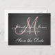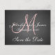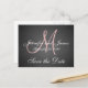 Elegant Black Chalkboard Save the Date postcard. Elke Clarke© for MonogramGallery at Zazzle. Modern, simple wedding announcement with printed chalkboard photo effect. A blush pink monogram initial in script typography with white text overlay. Fully customisable. Other colours and background effects available.