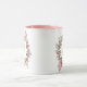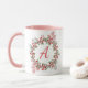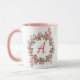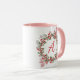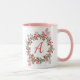 This is a elegant monogram mug featuring a wreath with Christmas berries and leaves in shades of pink and green. The letter inside the mug is customisable with the letter of the recipient.