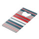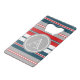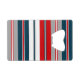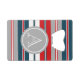 Nautical themed design with monogram decoration in round shape on blue, white, red and grey striped background