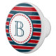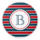 Nautical themed design with monogram decoration in round shape with stars on blue, red and white striped background