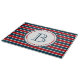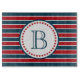 Nautical themed design with monogram decoration in round shape with stars on blue, red and white striped background