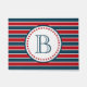 Nautical themed design with monogram decoration in round shape with stars on blue, red and white striped background