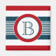 Nautical themed design with monogram decoration in round shape on blue, white and red striped background