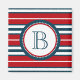Nautical themed design with monogram decoration in round shape with rope illustration on blue, red and white striped background