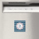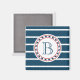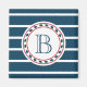 Nautical themed design with monogram decoration in round shape on blue and white striped background