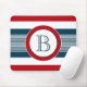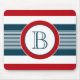 Nautical themed design with monogram decoration in round shape on blue, white and red striped background