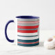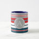 Nautical themed design with monogram decoration in round shape on blue, white, red and grey striped background
