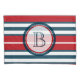 Nautical themed design with monogram decoration in round shape with rope illustration on blue, red and white striped background