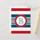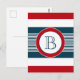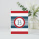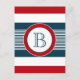 Nautical themed design with monogram decoration in round shape on blue, white and red striped background