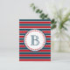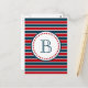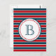 Nautical themed design with monogram decoration in round shape with stars on blue, red and white striped background