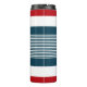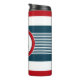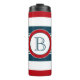 Nautical themed design with monogram decoration in round shape on blue, white and red striped background