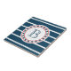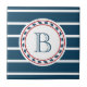 Nautical themed design with monogram decoration in round shape on blue and white striped background
