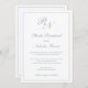 Traditional style All In One Wedding Invitation with a simple and classic design with your two initial monogram and your names in an elegant calligraphy inside of a thin border. The back has your guest details eliminating the need for a separate enclosure card. All design elements are in dusty blue over a white background and may be changed in the design editing tool. These elegant All In One Wedding Invitations are perfect for a formal wedding.