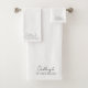 Personalised elegant monogram black script and serif name, blush pink bathroom towel set. Refresh your bathroom decor with a minimalist typographic style.