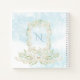 Beautiful pastel blue background with elegant ornate ivory design and monogram. Green eucalyptus.
