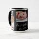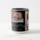 On this stylish black mug is a monogram letter in the corner i then 3 photos with the text in the middle with family name and date where you can customise to your liking with your own photos and family name.