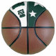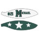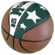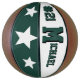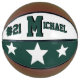 This is a full size basketball with two panels designed with a monogram name (large first letter) and uniform number, in popular college colours. This one is shown in Green & White. The second panel has team colours with three stars. All text, art, and colours can be removed, or changed as desired. One panel can be left white for autographs, etc.