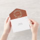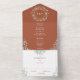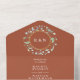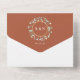 All in one wedding invitation featuring a decorative laurel floral garland and gold border containing your monogram initials on a terracotta background. The invitation includes a perforated RSVP card that’s can be individually addressed or left blank for you to handwrite your guest's address details. Designed by Thisisnotme©