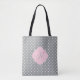 Monogrammed white on grey polka dot pattern with pastel pink accent All-Over-Print Tote Bag. The design features a white and grey polka dot pattern and a pastel pink quatrefoil shape with your custom initial.