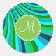 Monogram Groovy Blue Green Rainbow Slide Stripes Classic Round Sticker