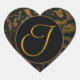 Black and gold Monogram seals on heart shape with a beautiful scrolling script text art on elegant floral damask. These stickers add a unique touch of class to your wedding invitations!