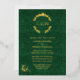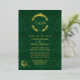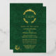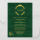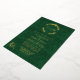 Ornate gold foil wedding invitation done in an elegant green damask with a gold foil floral wreath decoration, at the top, with the couple's monograms. Personalise the foil text to suit your wedding needs.