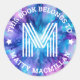 Bookplate labels featuring your monogram initial and customisable text "this book belongs to" and your name on a blue and purple pattern background.