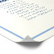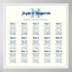 Ecru, with blue text, seating chart poster with monogram initial behind first names. Navy blue text templates are provided to list ten guests’ names at each corresponding table. Table number headings are in bold text to match the font used for the couple’s names at the top. Each table section has space to list ten names making this chart able to seat 150 guests or more, if names are doubled up. Table sections can also be deleted to seat fewer guests. One monogram initial, in lighter blue, is printed behind the names at the top. A thin blue line frames the entire chart.