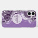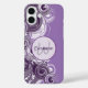 The phone case design features a spiral wave in white and shades of purple with an initial letter monogram centred on it. Personalise the template field with your information, remove one text element or click customise to select a font style, size, and colour you prefer. In customise, you can also select a colour other than teal for the background.