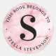 Bookplate labels featuring a your monogram initial and customisable text "this book belongs to" and your name on a light pink marble look background.