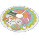 A snowman in a top hat, a snowman in a pink winter hat and striped scarf, a background of white polka dots on mustard, aqua blue, pink, and orange with a white star that you can easily customise with your monogram initial! This pretty snowman Christmas tree skirt will be a treasured item year after year!