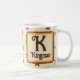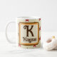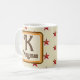 This monogram morning tea or coffee mug is a great way to add a colourful touch to your morning routine. An elegant pink and red star pattern appears against a beige background. The letter "K" is featured in a square along with the family name on both sides of this mug. The letter and your name can quickly and easily be personalised.