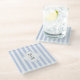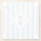 Glass coaster featuring a light dusty blue and white striped pattern with your monogram initials in dark grey over a white diamond shape. All colours are customisable.