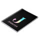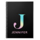 Chic personalised black notebook with a "J" initial monogram in large bold type with a pink, yellow, mint green and teal blue rainbow gradient. Add your name below in simple pink typography.