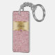 Monogram keychain with pretty printed gold monogram emblem you can personalise with any name, initials, or message and pink diamond jewel bling, along with printed pink glitter background you can use as a gift or party favour. Designed as keychains for women or keychains for girls, in a fun two side acrylic design that lets you carry your keys in style.