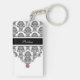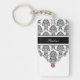 Monogram keychain with pretty black and white damask pattern gold monogram emblem that includes a printed purple diamond jewel bling. Personalise with any name, initials, or message as a gift or party favour. Designed as keychains for women or keychains for girls in a fun two side acrylic quality product that lets you carry your keys in style.