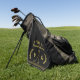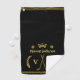 These golf towels make the perfect gift for an avid golfer. Personalized with name and initials, the design also includes golf clubs, balls, a crown, and a laurel wreath. The design is made in all gold on a black background (Customize / Personalize Further to change the background color).