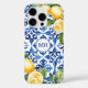 Monogram Lemon Citrus Fruit Elegant Mediterranean iPhone 16 Pro Case features bright yellow watercolor lemons and green leaves layered over a classic blue and white Mediterranean tile background. Centred with a clean monogram, it brings stylish Positano and Amalfi Coast vibes to your everyday essentials. A fresh, personalised look perfect for summer or spring.