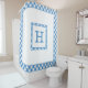 Custom shower curtain features a large, bold light blue monogram on a white background with a geometric frame of baby blue, light blue, and white triangles. The outer edge border features bright blue, white, and pale blue diamonds in a buffalo check pattern. Add your initial in the sidebar.