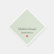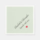 Create your own custom, personalised, elegant black typography / calligraphy / script / font on light sage green colour background, bride groom / couple names, wedding / anniversary date, red heart, your choice of white or ecru coloured, coined or standard style, food contact safe, party celebration cocktail luncheon dinner paper napkins that look good tucked in the collar or draped over your lap. Simply type in the bride and groom's or wife and husband's names, and the wedding date, to customise. Elegant, classy paper napkins, perfect for wedding reception, anniversary celebrations, engagement party, and more.