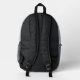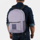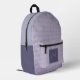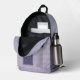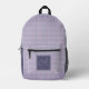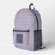 This backpack features a monogram patch in purples on the front over a multi-line weave-like plaid design in mauve, lilac and lavender purples, with solid purple half panels on he side.