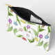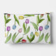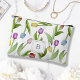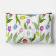 The product design features a pattern of colourful tulip flowers in purple, red, pink, blue, and yellow. This botanical illustration with personalised text makes a modern and unique accessory pouch.