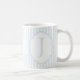 This elegant monogram mug features a soft blue and white striped design with the letter J in the center.