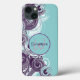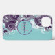 The phone case design features a spiral wave in white and shades of purple with an initial letter monogram centred on it. Personalise the template field with your information, remove one text element or click customise to select a font style, size, and colour you prefer. In customise, you can also select a colour other than teal for the background.