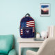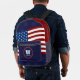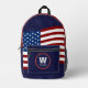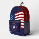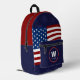 This design features American flag and map pattern with red blue and white stripes. Custom American flag monogrammed name backpack in high quality. This design can be easily edited. If you need help with the customisation please message me via Zazzle.