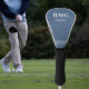 Protect your driver club in style with this highly rated golf head cover featuring modern platinum colour initials and name accented with a row of pinstripes. The background is a classic blue jean denim print. Easily change initials and name to make it yours using the Template provided. Dimensions: 12"x 5"x 3". Fits most standard drivers, but NOT meant for fairway woods or hybrid clubs. Print, cut, sew construction made entirely by hand for maximum quality. Choose from 15 piping colours (black shown). See "About This Product" at side for more information. Made in the USA.